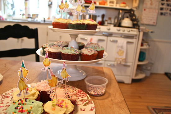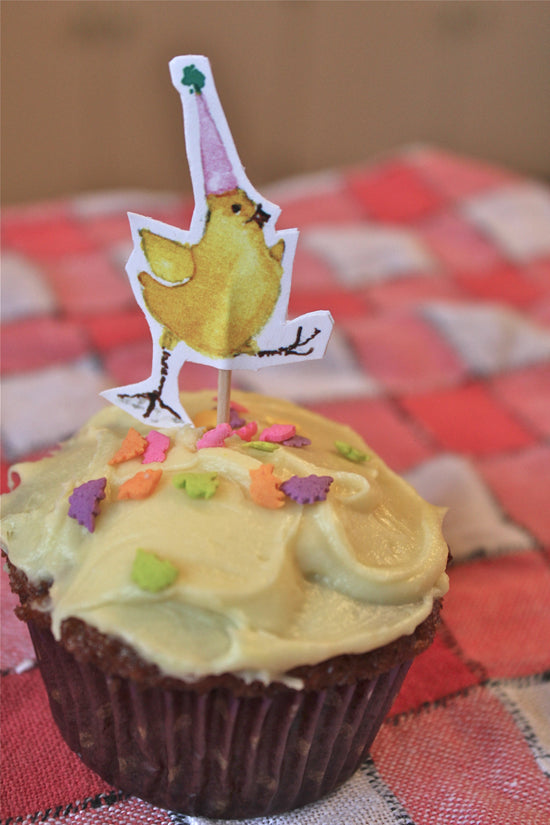 Kit includes recipe card for my delicious Carrot Cupcakes, 12 paper toppers to cut out and make yourself, and instructions. Assembly will require scissors, toothpicks, and glue.