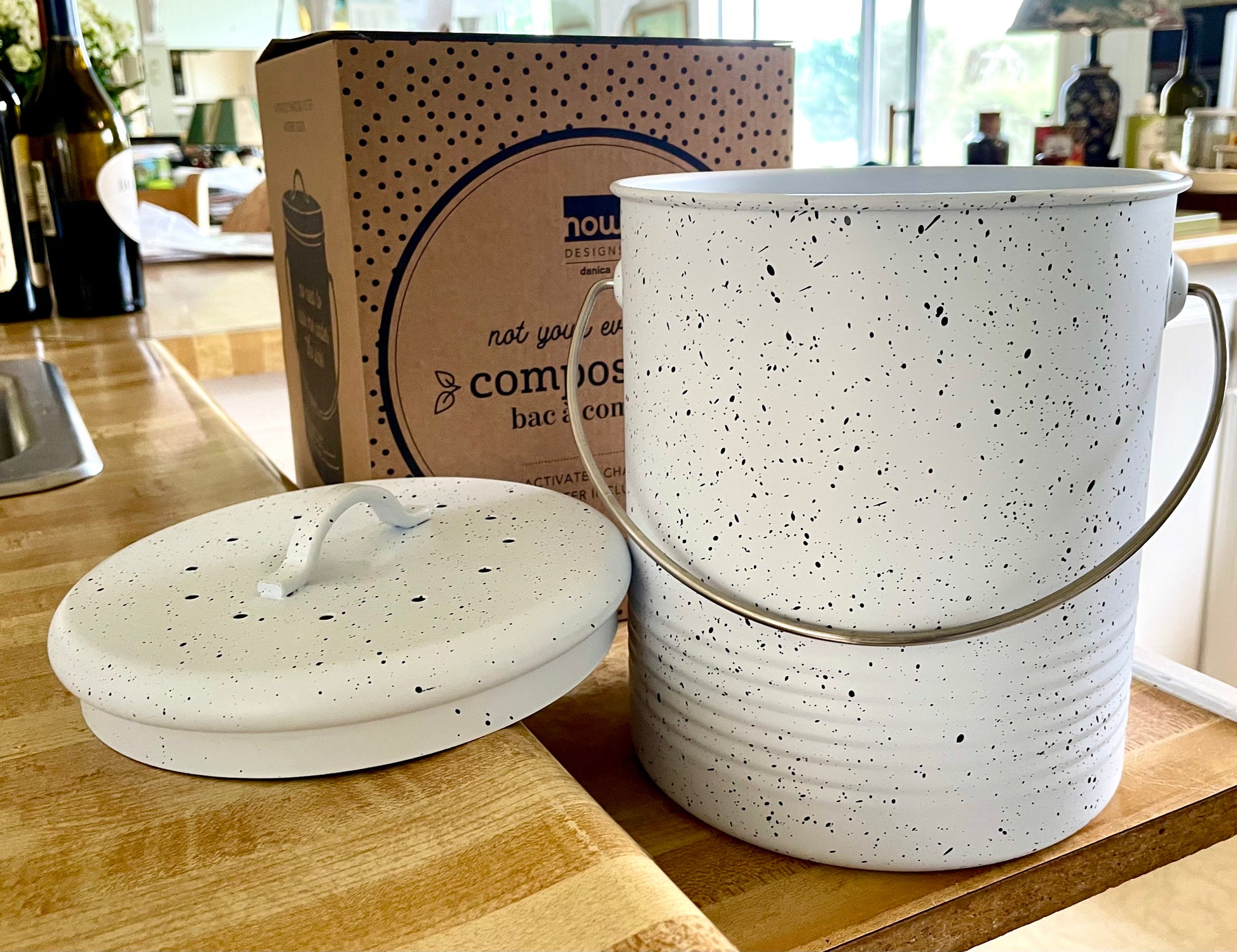 Speckled Compost Bin, cute enough to leave on your counter. :)