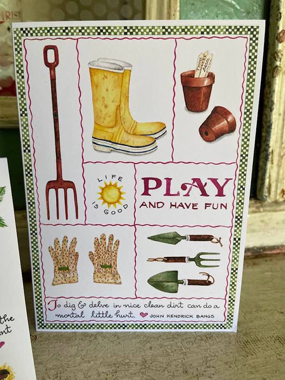 Set of 12 Susan Branch all-purpose Note Cards with Envelopes, 6 of each design ... "Play and Have Fun" AND "My Little Garden". Cards are uncoated paper, 4.25" x 6". Full color with Susan's art on the front, inside, and back of cards.