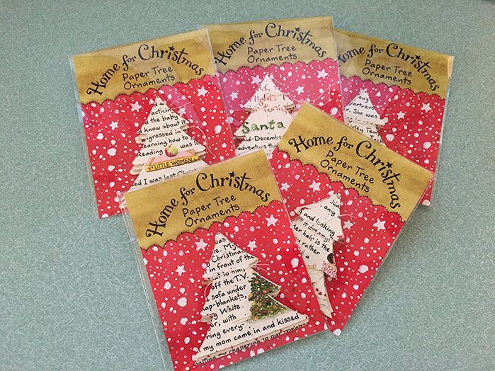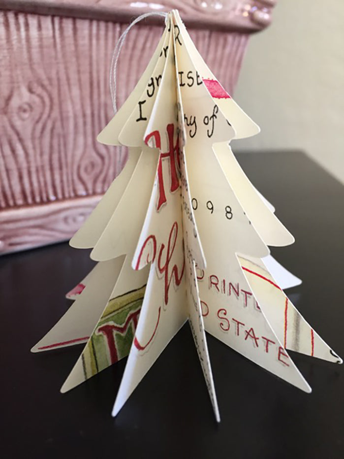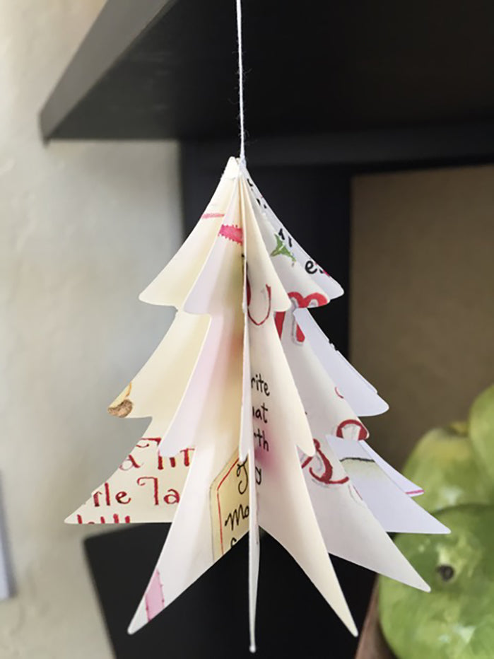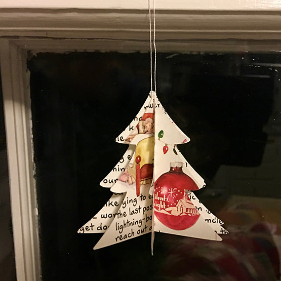 Set of 3 ornaments. Each ornament is re-purposed from pages of Susan's book "Home for Christmas". Each paper tree ornament will be unique, using different pages.